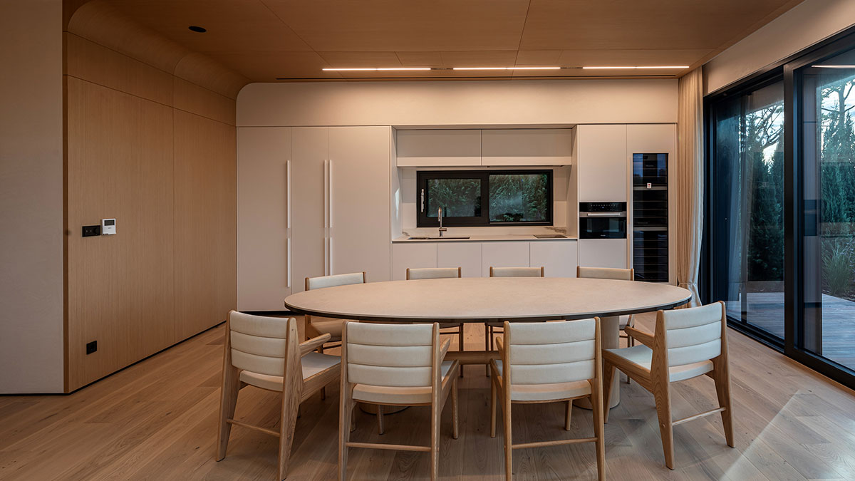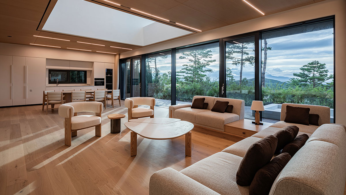 나무의 향과 멋이 살아 있도록 목구조를 노출시켰으며, 천창을 통해 비춰진 그림자가 자연스러움을 극대화하고 국내 유일의 2중 목구조와 간접조명으로 멋을 더했습니다. 1층에는 10미터의 야외 수영장과 야외 욕조가, 2층에는 가족들의 아지트인 원형 소파와 자연을 비추는 긴 복도, 널찍한 테라스로 가족의 웃음이 떠나지 않는 공간입니다.