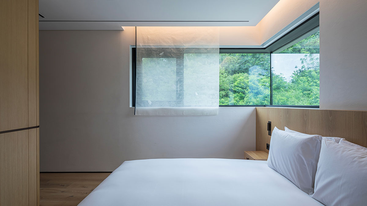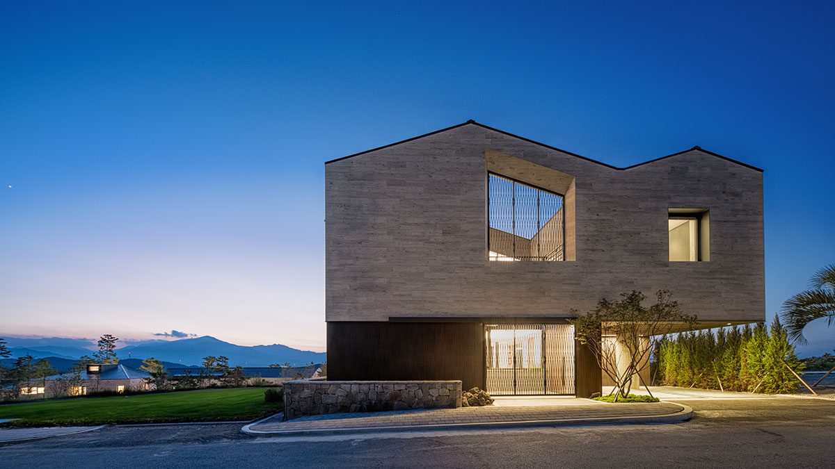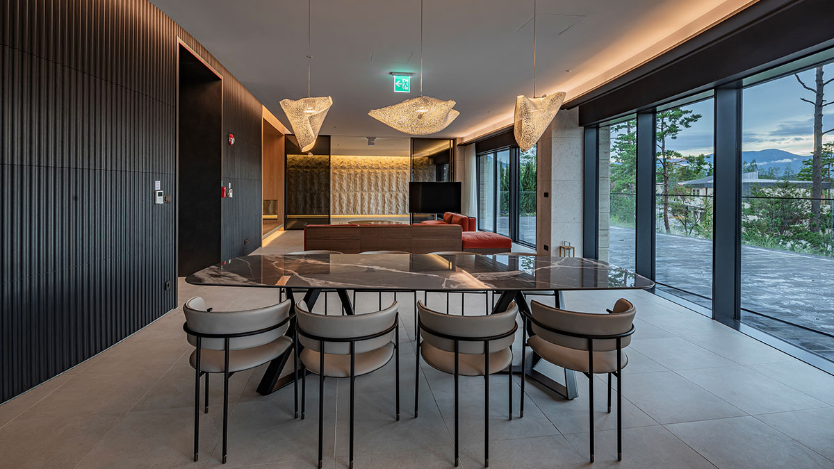 2층 지붕에 설치된 6미터의 긴 천창이 거실까지 연결되어 10미터 높이의 빛이 실내를 비추도록 하여 낮에는 양양의 청정 하늘과 밤에는 쏟아지는 별을 누릴 수 있도록 하였습니다. 설해원의 아이덴티티를 살린 지붕, 서까래를 현대적으로 해석한 외부 또한 주변의 자연환경과 아름답게 조화를 이룹니다.